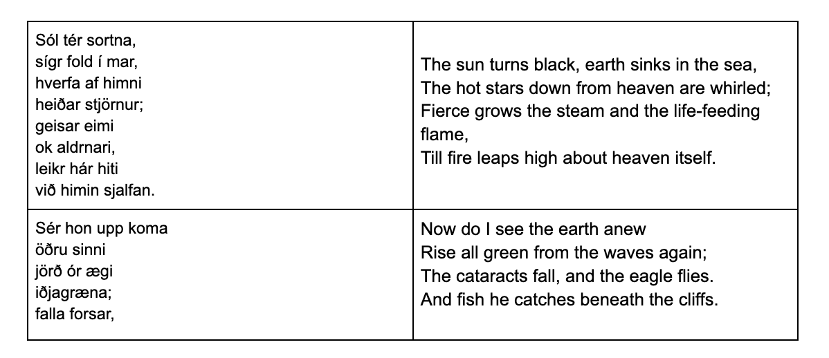 –the most well-known prophecy of a Völva is cited in the Voluspa poem, which cannot be definitively dated but is believed to have first been written down in the 9th century in Old Norse and is quoted extensively in Snorri Sturluson’s Prose Edda and the Poetic Edda, the earliest manuscript of which dates from the 13th century, but it is thought to be much older, and is generally believed to have been a minstrel poem that was passed down orally. The Voluspa verses recount the Norse god Odin waking a dead Völva at her tomb, demanding a prophecy, and interrogating her about the future of the world and the cosmos. I am particularly taken by two of the 60 strophes of this poem, in which the Völva describes her visions, of both an apocalyptic scenario and yet also, following it, a rebirth/regreening of the land:
